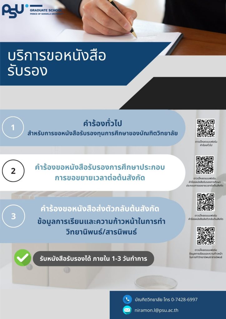 บัณฑิตวิทยาลัย ให้บริการออกหนังสือรับรองทั้งฉบับภาษาไทยและภาษาอังกฤษ